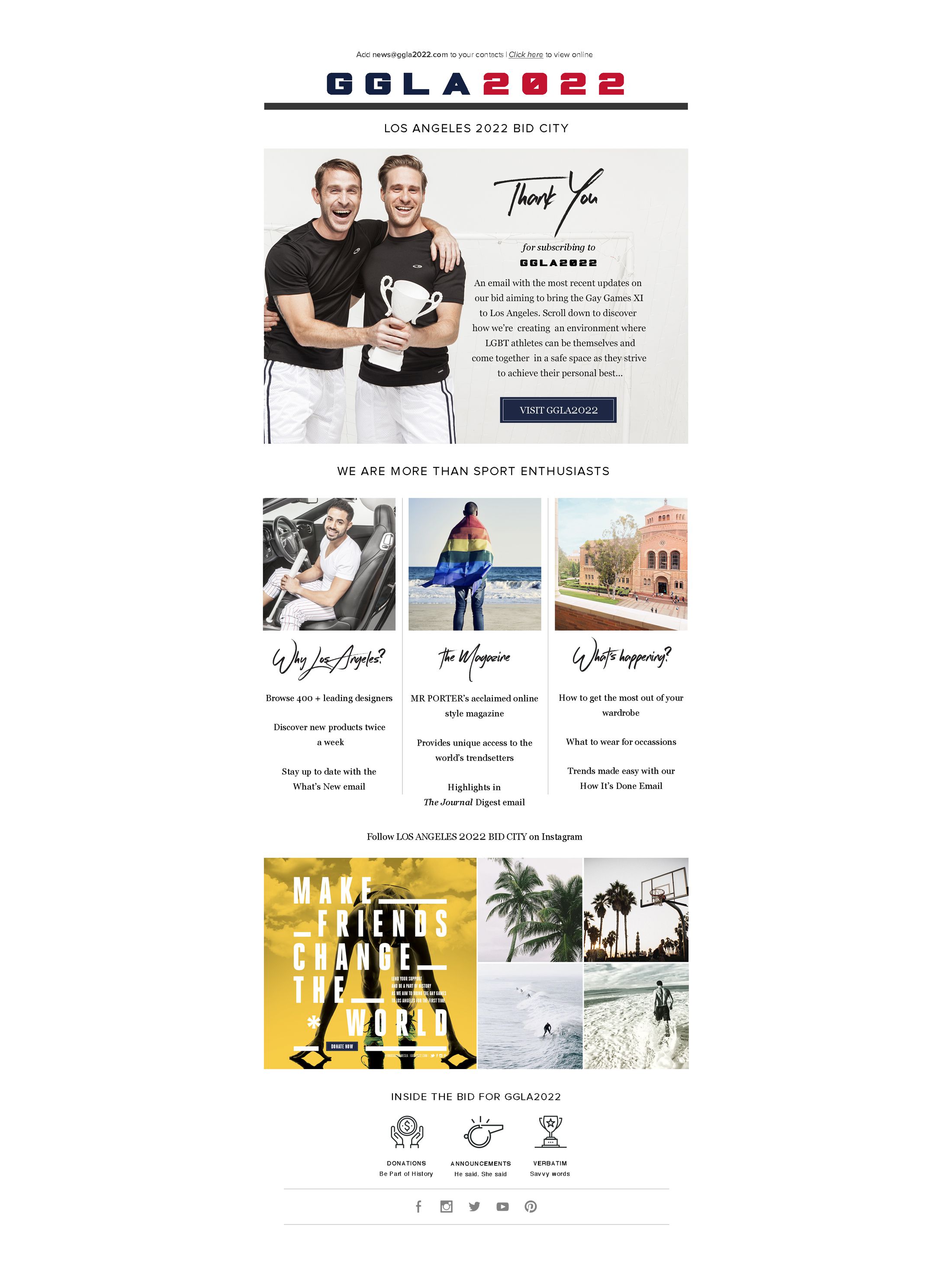 I spearheaded the look for a social media campaign as one of the first initiatives, to help the organizers bring awareness and collect funds for the bid. The GGLA 2022 website was built to provide extensive information about the goals and motivation behind the bid and its importance for the City of Los Angeles.