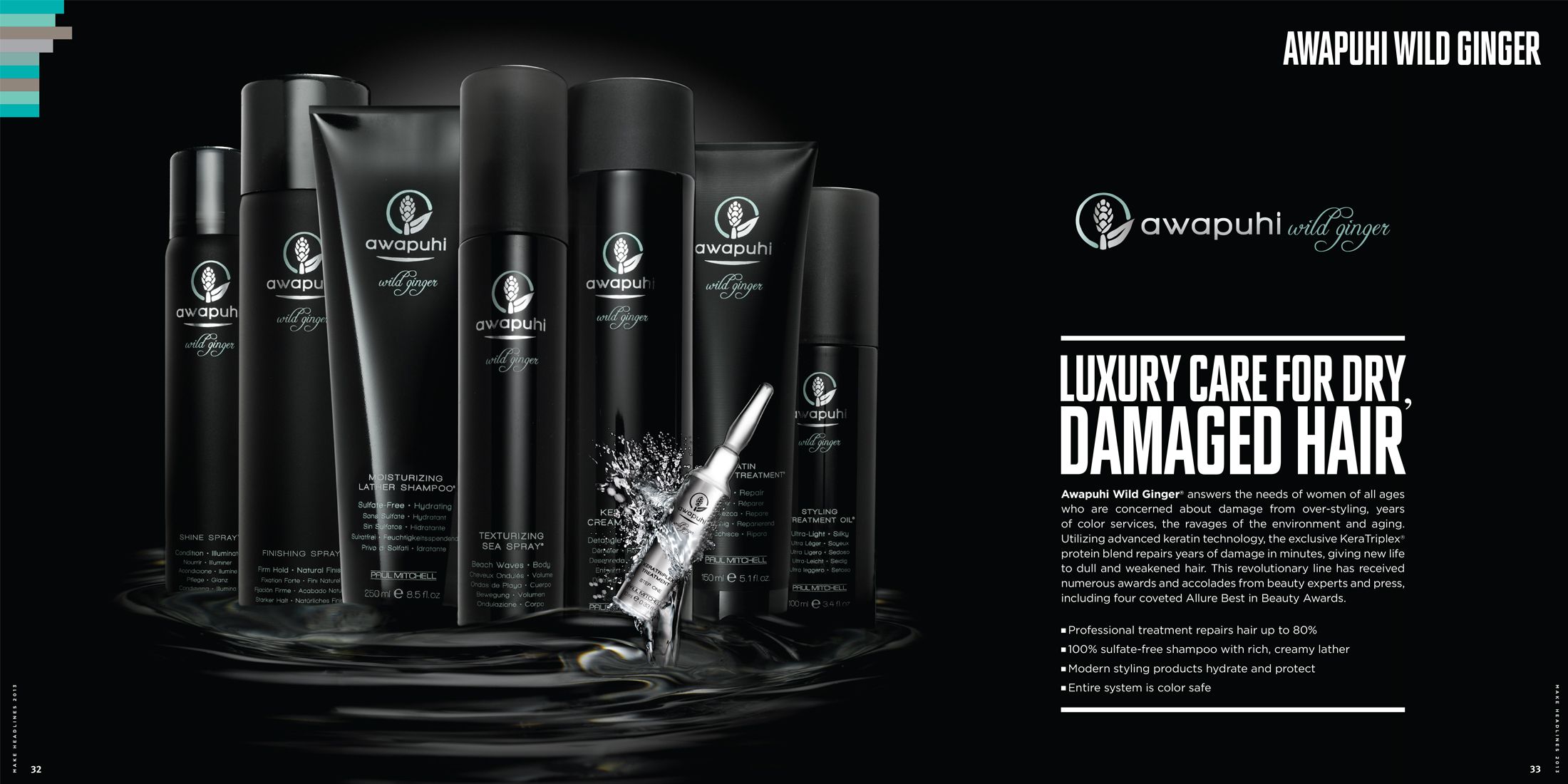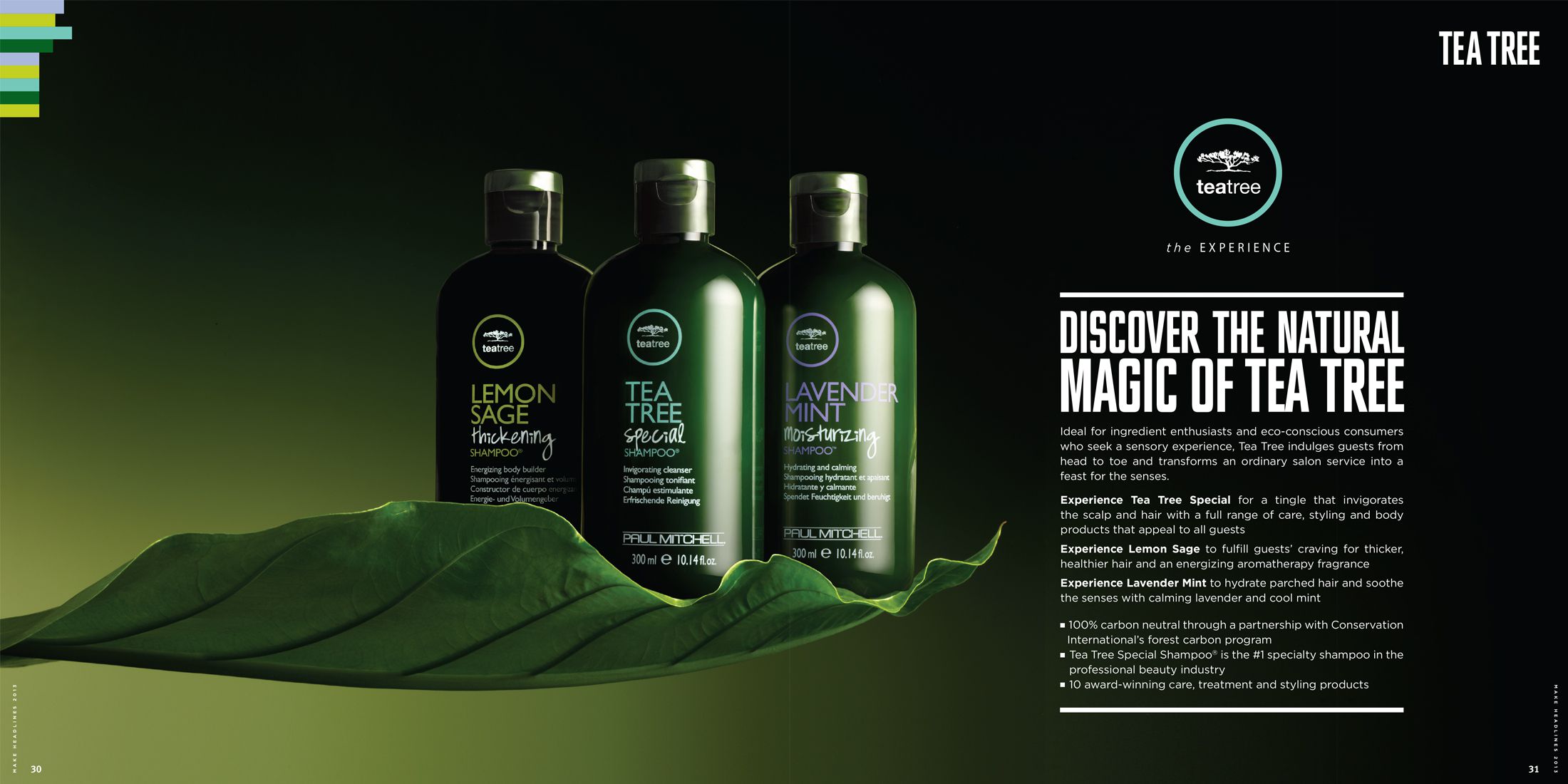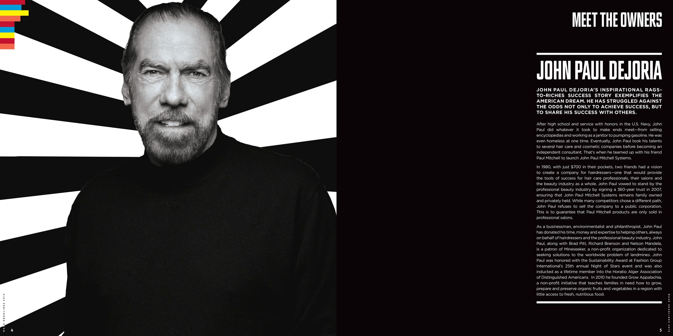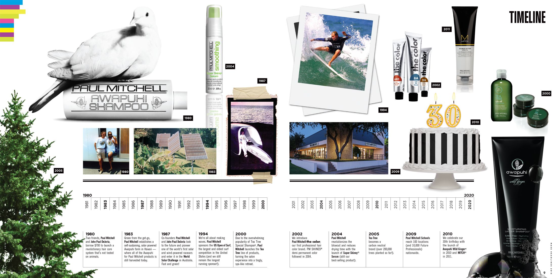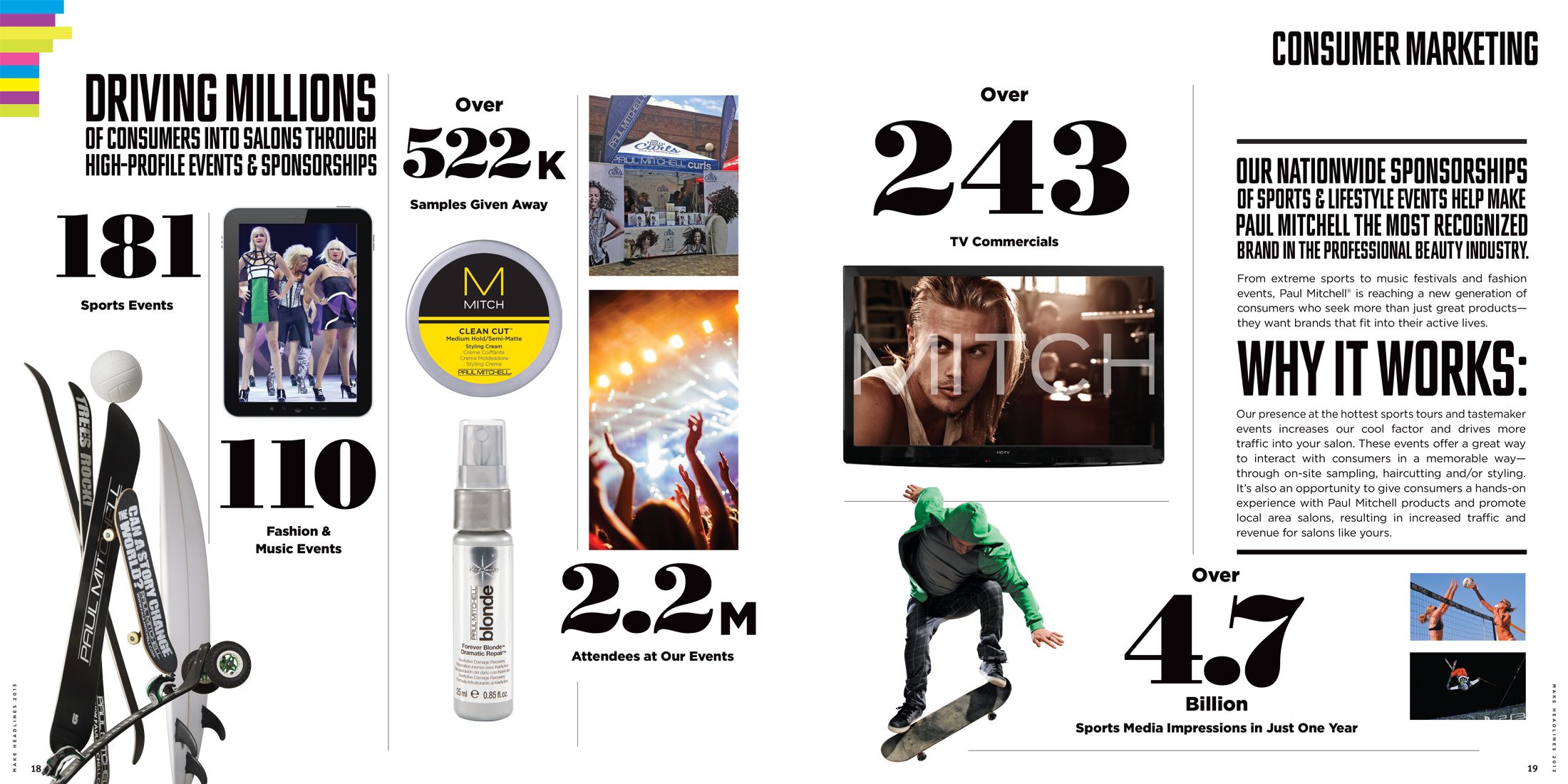 Once a year the Make Headlines brochure is produced, with the intention of presenting Paul Mitchell products to the hairdresser community. The booklet succeeds at presenting the large variety of health and beauty aid products, but also makes a point by reinforcing the values of the company and its commitment to the environment.