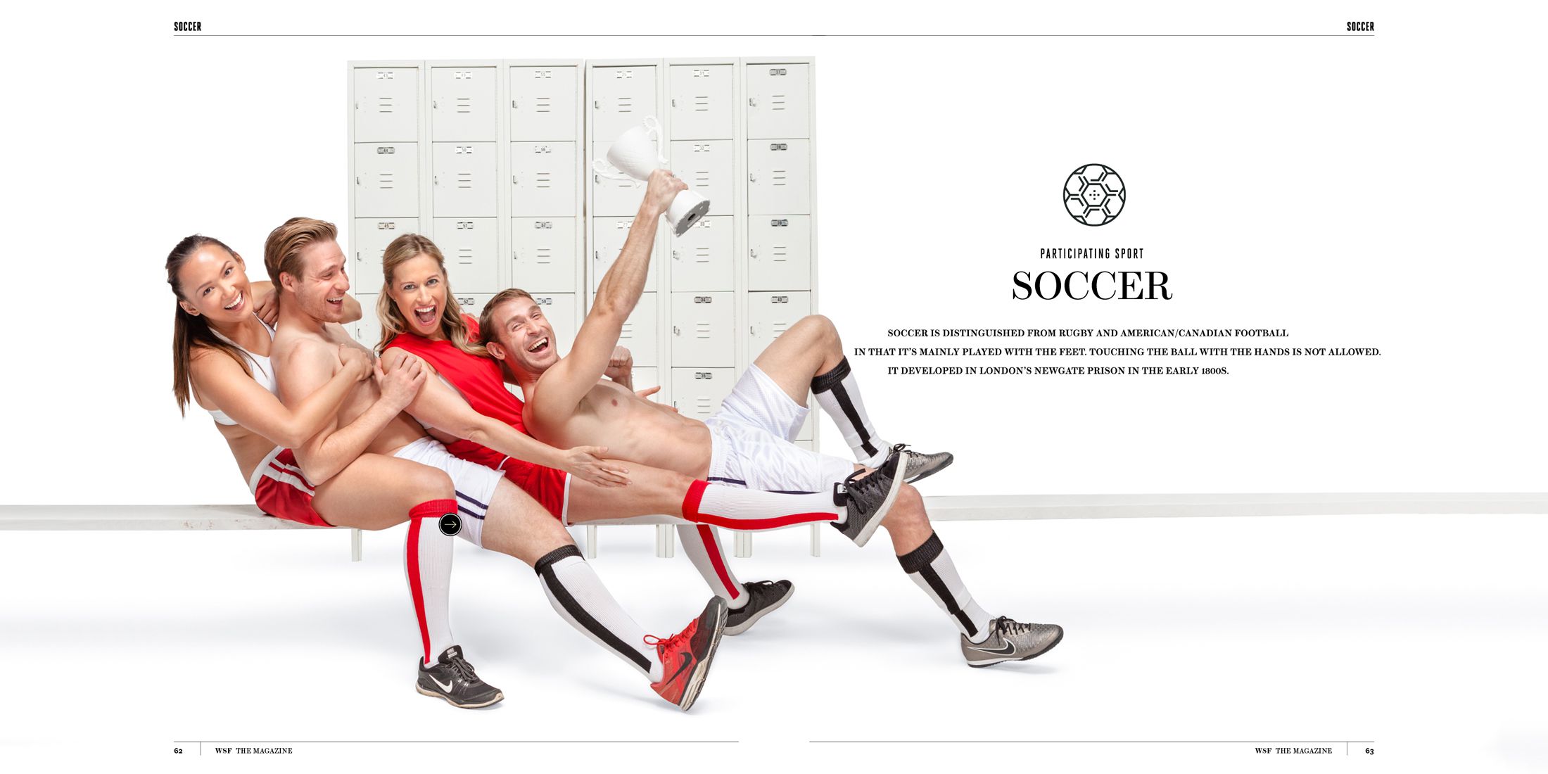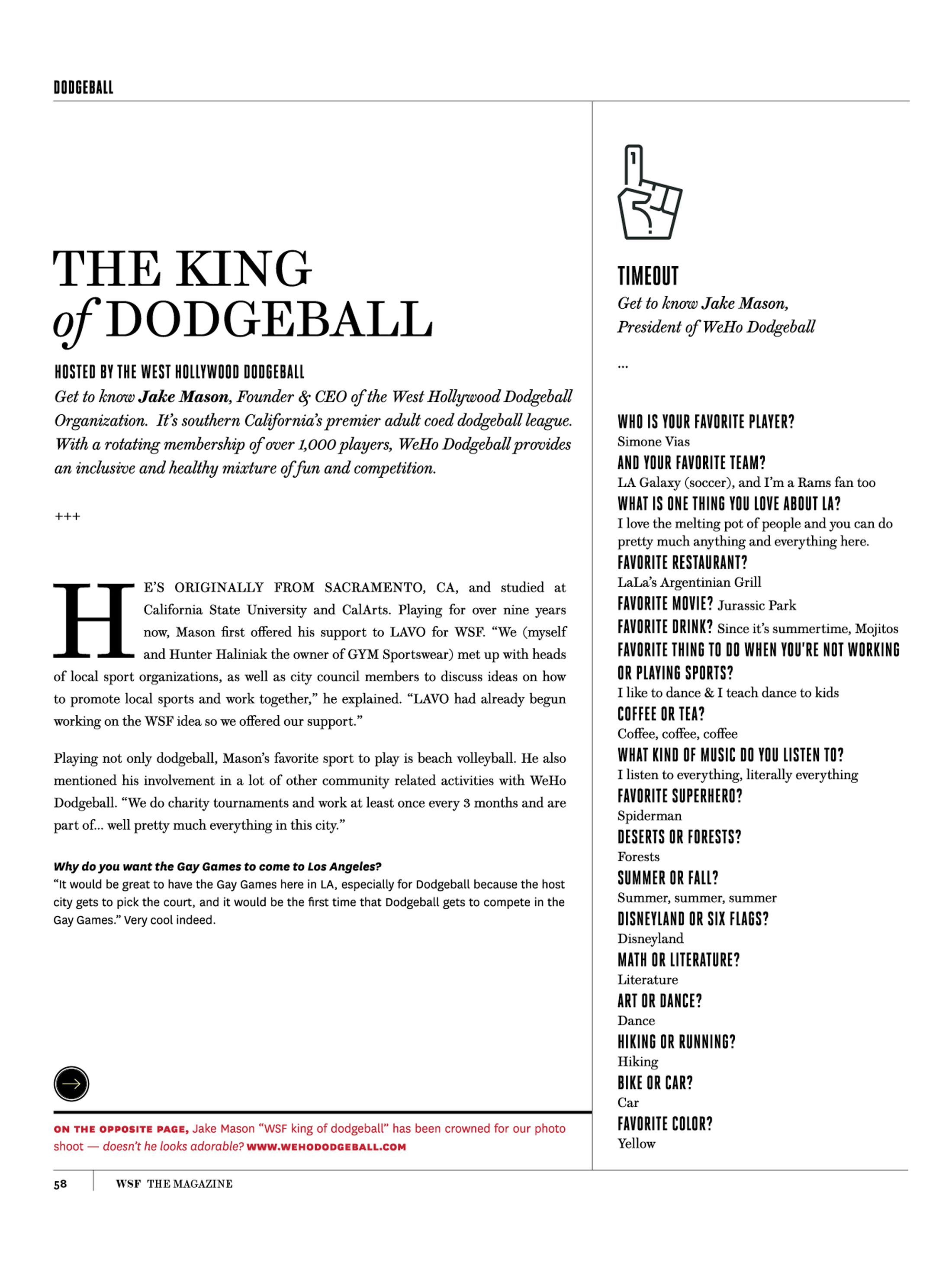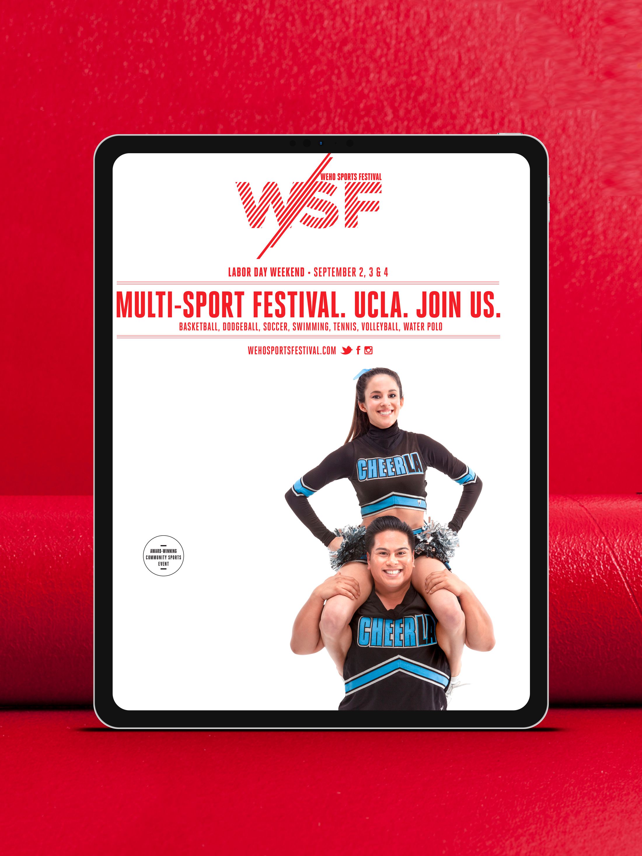 The WSF magazine is the signature piece for the event. The magazine showcases the best of the multi-sport event, presenting the teams, volunteers, a few participants, advertisement efforts, letters from readers and bios from some of the sports leaders. I produced a publication with a total of eight different covers, one for each sport, while the content inside was the same across the sports. Collateral created for the sports event sponsored by the City of West Hollywood in California included a poster campaign, multiple promotional items and social media centered on the vibrancy of sports.